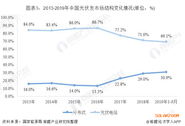 不同于光伏電站,分布式光伏發(fā)電是指在用戶所在場地或附近建設(shè)運行,以用戶側(cè)自發(fā)自用為主、多余電量上網(wǎng)且在配電網(wǎng)系統(tǒng)平衡調(diào)節(jié)為特征的光伏發(fā)電設(shè)施。近年來,國家對分布式光伏發(fā)電系統(tǒng)一直采取積極鼓勵的態(tài)度,并出臺了一系列扶持措施。2016年底出臺的《電力發(fā)展“十三五”規(guī)劃》對分布式光伏設(shè)定了超常規(guī)發(fā)展目標(biāo):“2020年,太陽能發(fā)電裝機(jī)達(dá)到1.1億千瓦以上,分布式光伏6000萬千瓦以上”。隨著各地分布式光伏發(fā)電建設(shè)的推進(jìn)。我國光伏發(fā)電市場結(jié)構(gòu)發(fā)生改變,尤其是2016年以來,我國分布式光伏市場份額已經(jīng)由13.3%提升至30.9%。