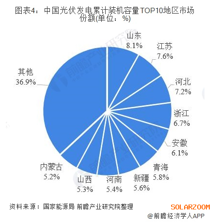 累計裝機(jī)容量方面,截至2019年第三季度,我國共有9個地區(qū)光伏發(fā)電累計裝機(jī)容量超過1000萬千瓦。其中山東以1541萬千瓦,排名第一,占全國總裝機(jī)容量的8.1%;江蘇和河北緊隨其后,分別以1445萬千瓦和1363瓦千瓦占全國總裝機(jī)容量的73.6%及7.2%。
